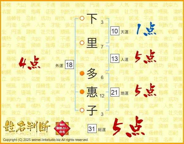 下(3画)里(7画) 多(6画)惠(12画)子(3画)