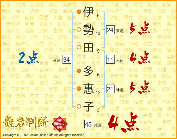伊(6画)勢(13画)田(5画) 多(6画)惠(12画)子(3画)