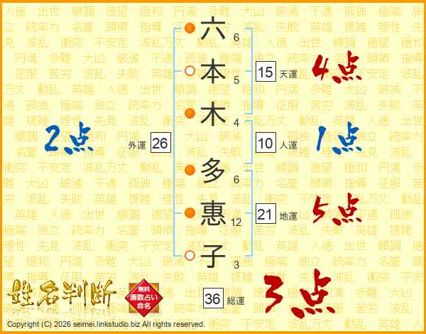 六本木多惠子さんの総運は36画の3点!