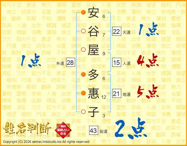 安谷屋多惠子さんの総運は43画の2点!