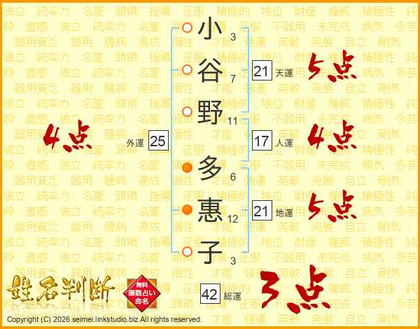 小(3画)谷(7画)野(11画) 多(6画)惠(12画)子(3画)