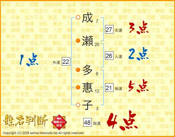 成(7画)瀬(20画) 多(6画)惠(12画)子(3画)
