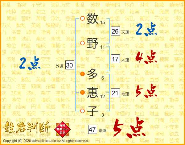 数(15画)野(11画) 多(6画)惠(12画)子(3画)