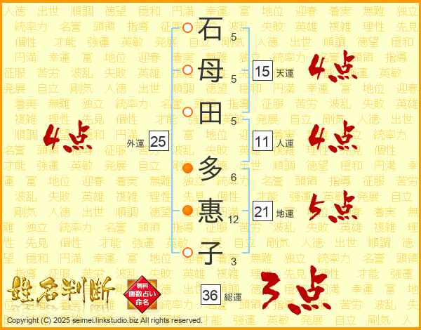 石(5画)母(5画)田(5画) 多(6画)惠(12画)子(3画)