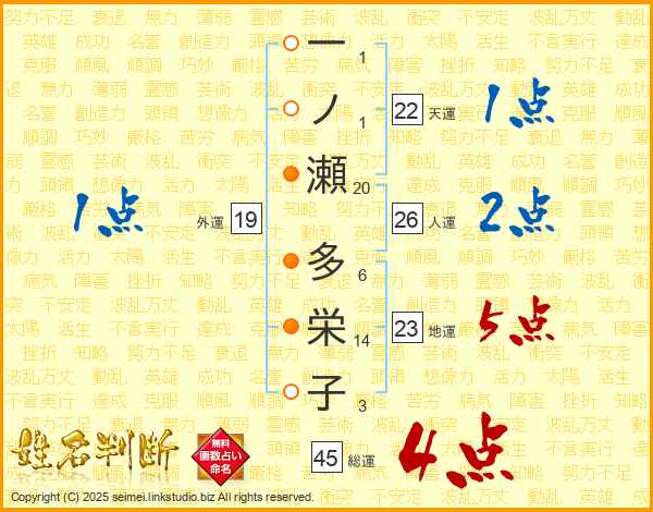 一(1画)ノ(1画)瀬(20画) 多(6画)栄(14画)子(3画)