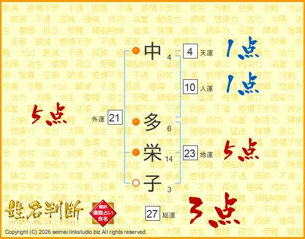 中(4画) 多(6画)栄(14画)子(3画)
