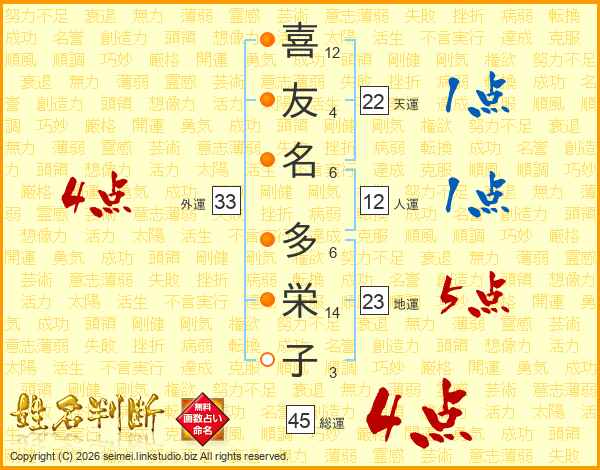 喜(12画)友(4画)名(6画) 多(6画)栄(14画)子(3画)
