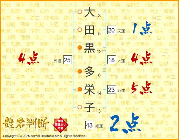 大(3画)田(5画)黒(12画) 多(6画)栄(14画)子(3画)