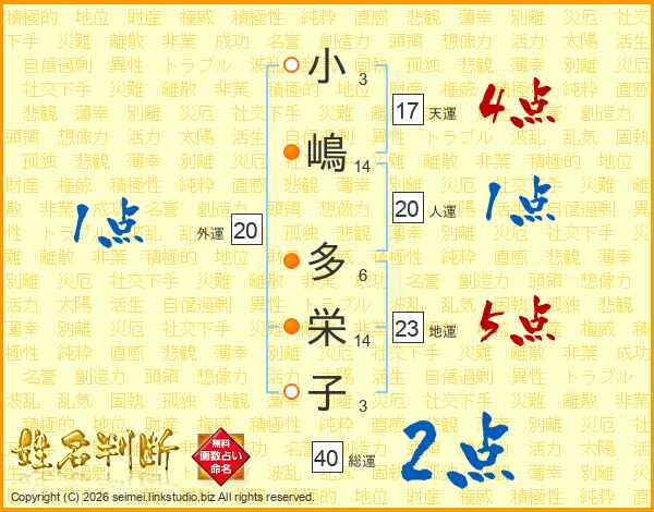 小(3画)嶋(14画) 多(6画)栄(14画)子(3画)