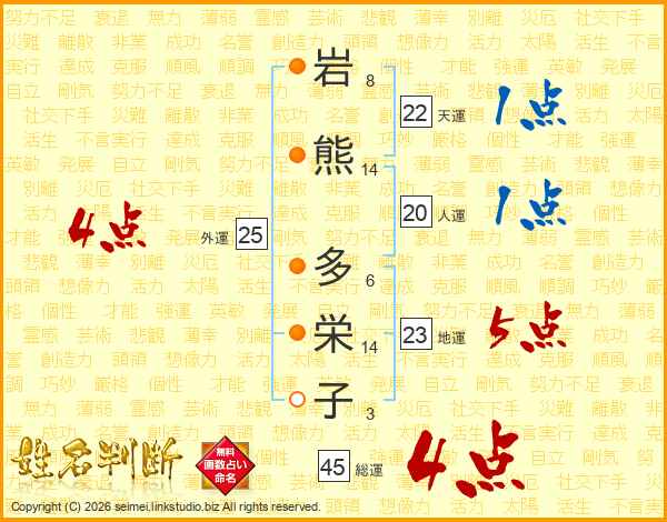 岩(8画)熊(14画) 多(6画)栄(14画)子(3画)