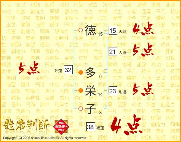 生活面を象徴する運勢です。外部から受ける影響力を表し、結婚運、家庭運や職場、環境への順応性を表します。総運から人運を引いた画数。姓や名が1文字の場合を除く。
