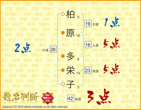 柏(9画)原(10画) 多(6画)栄(14画)子(3画)
