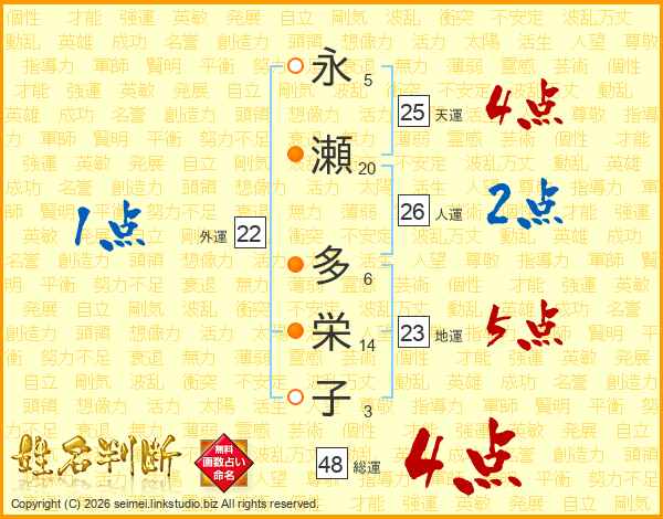 永(5画)瀬(20画) 多(6画)栄(14画)子(3画)