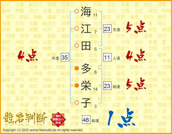 海(11画)江(7画)田(5画) 多(6画)栄(14画)子(3画)