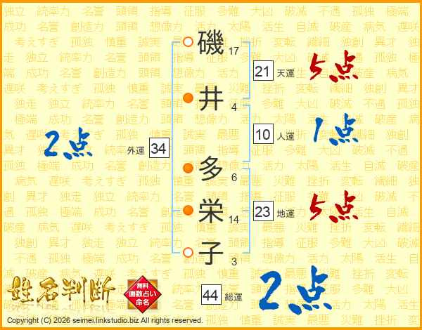 磯井多栄子さんの総運は44画の2点!