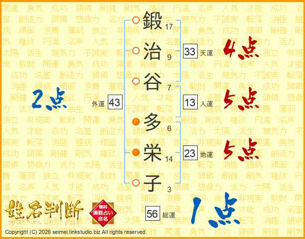 鍛(17画)治(9画)谷(7画) 多(6画)栄(14画)子(3画)