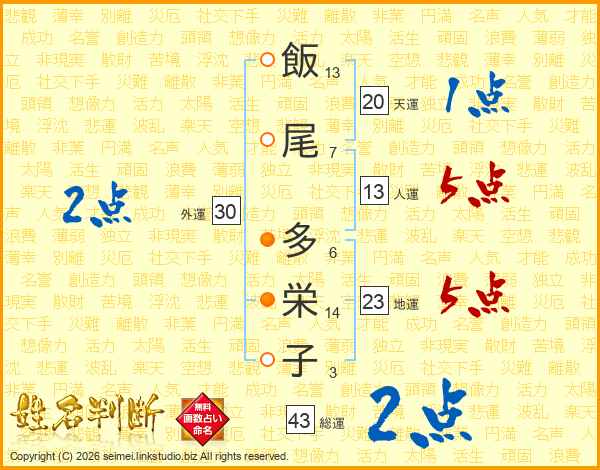 飯(13画)尾(7画) 多(6画)栄(14画)子(3画)