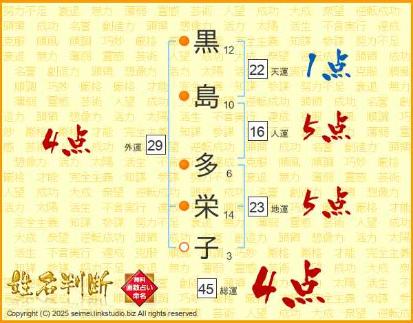 黒(12画)島(10画) 多(6画)栄(14画)子(3画)