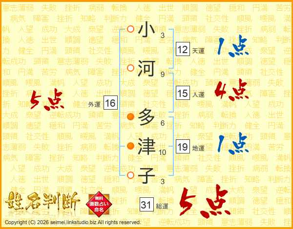 小(3画)河(9画) 多(6画)津(10画)子(3画)