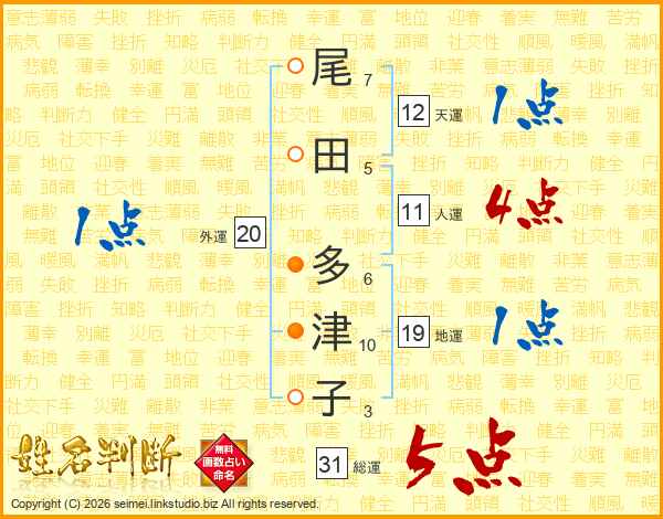 尾(7画)田(5画) 多(6画)津(10画)子(3画)