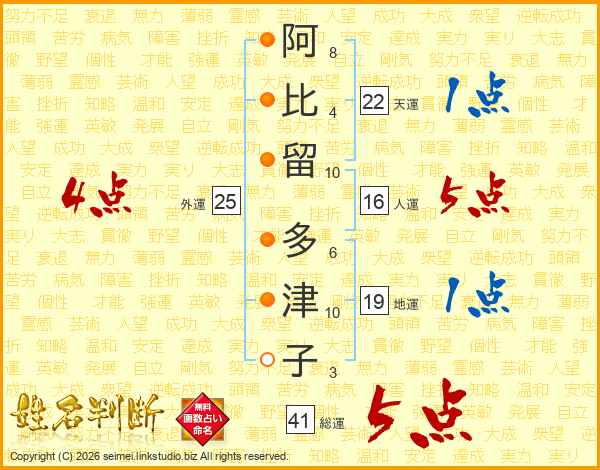 阿(8画)比(4画)留(10画) 多(6画)津(10画)子(3画)