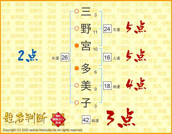 三(3画)野(11画)宮(10画) 多(6画)美(9画)子(3画)