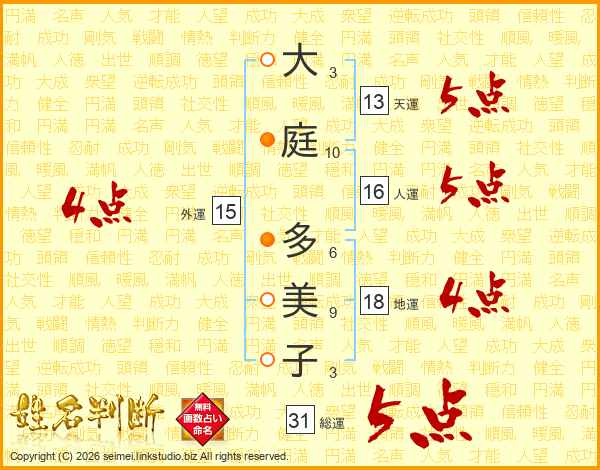 大(3画)庭(10画) 多(6画)美(9画)子(3画)