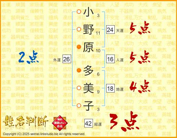 小(3画)野(11画)原(10画) 多(6画)美(9画)子(3画)