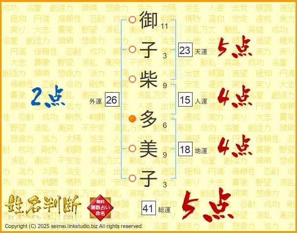 御(11画)子(3画)柴(9画) 多(6画)美(9画)子(3画)