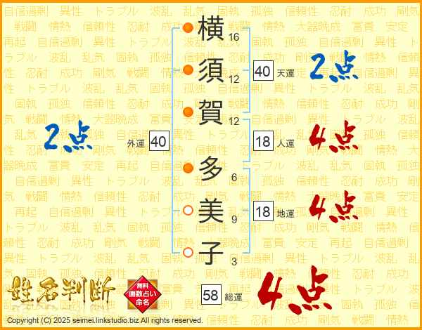 横(16画)須(12画)賀(12画) 多(6画)美(9画)子(3画)