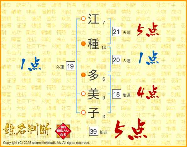 江(7画)種(14画) 多(6画)美(9画)子(3画)