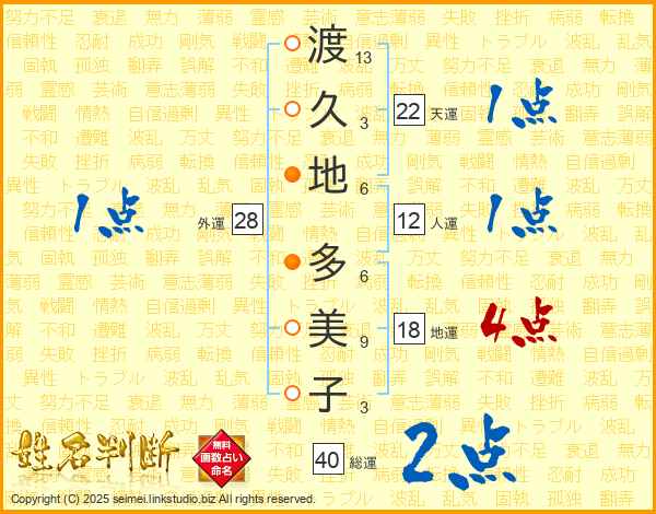 渡(13画)久(3画)地(6画) 多(6画)美(9画)子(3画)