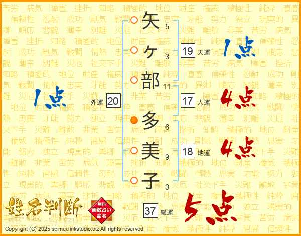矢ヶ部多美子さんの総運は37画の5点!