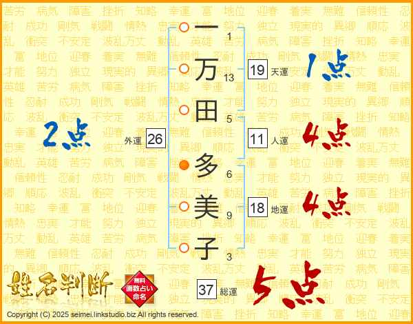 一(1画)万(13画)田(5画) 多(6画)美(9画)子(3画)