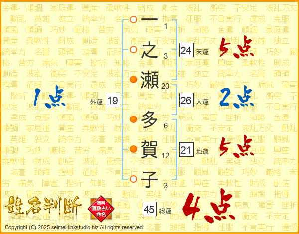 一之瀬多賀子さんの総運は45画の4点!