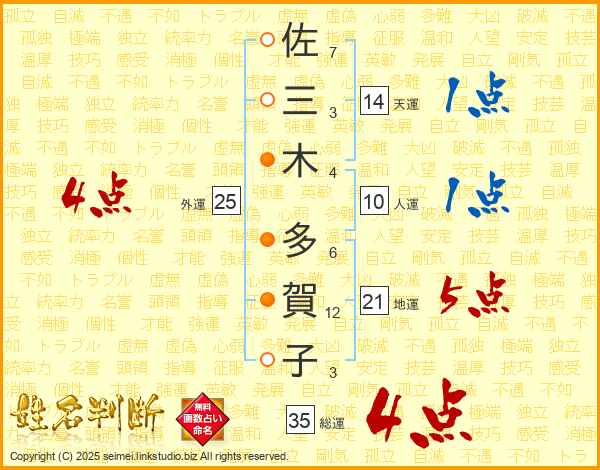 佐(7画)三(3画)木(4画) 多(6画)賀(12画)子(3画)