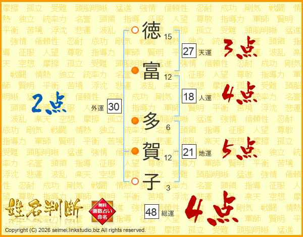 徳(15画)富(12画) 多(6画)賀(12画)子(3画)