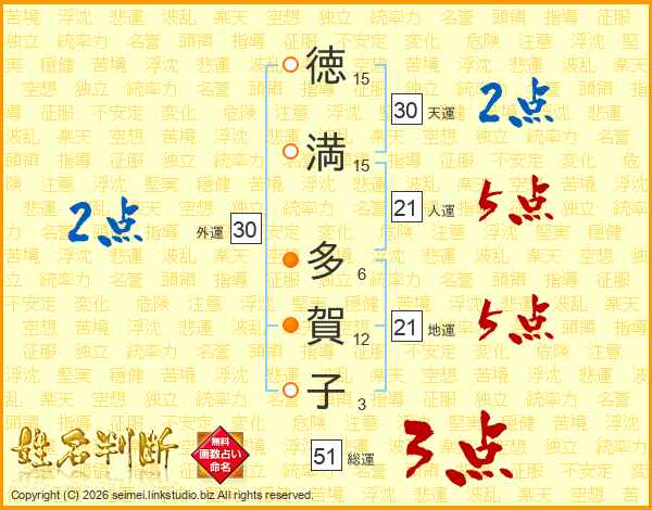 徳(15画)満(15画) 多(6画)賀(12画)子(3画)