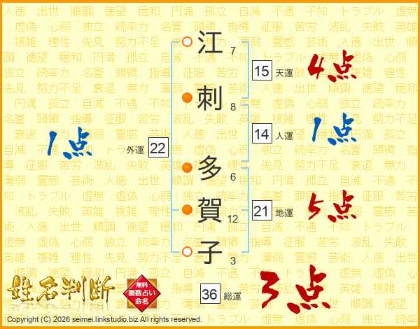 生活面を象徴する運勢です。外部から受ける影響力を表し、結婚運、家庭運や職場、環境への順応性を表します。総運から人運を引いた画数。姓や名が1文字の場合を除く。