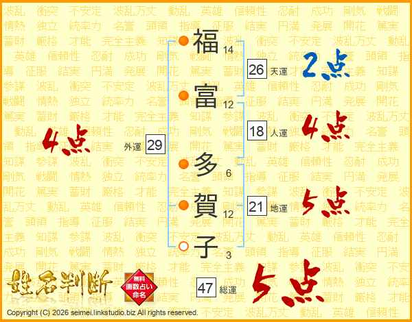 福(14画)富(12画) 多(6画)賀(12画)子(3画)