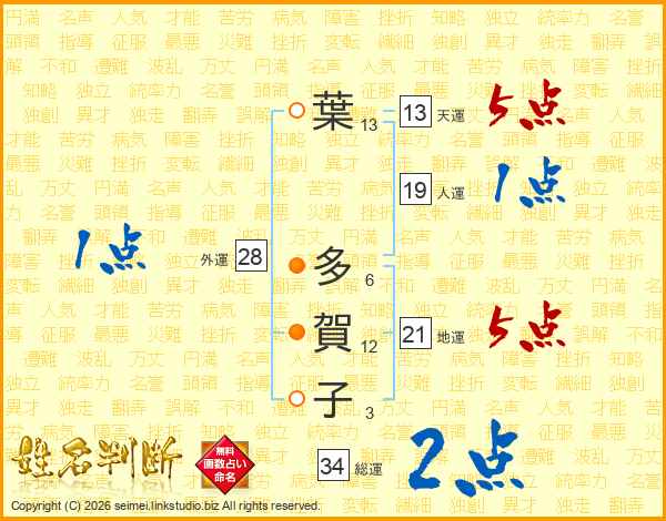 葉(13画) 多(6画)賀(12画)子(3画)
