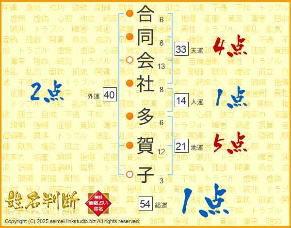 合(6画)同(6画)会(13画)社(8画) 多(6画)賀(12画)子(3画)