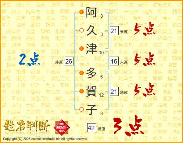 阿(8画)久(3画)津(10画) 多(6画)賀(12画)子(3画)