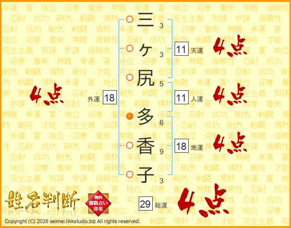 三(3画)ヶ(3画)尻(5画) 多(6画)香(9画)子(3画)
