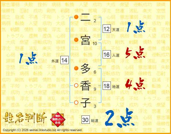 二(2画)宮(10画) 多(6画)香(9画)子(3画)