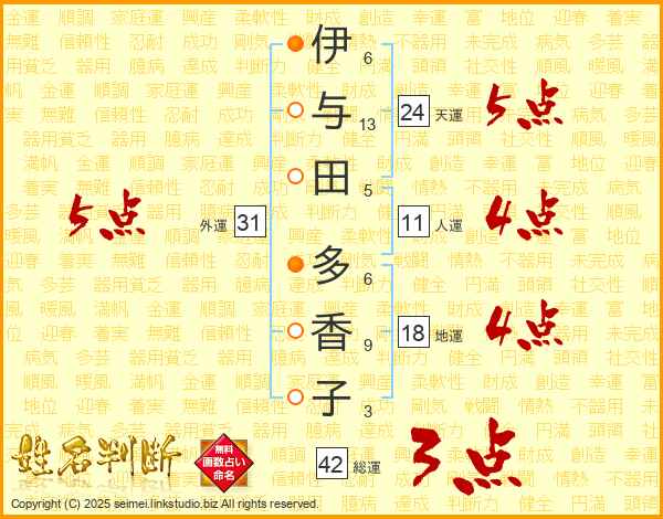 伊(6画)与(13画)田(5画) 多(6画)香(9画)子(3画)