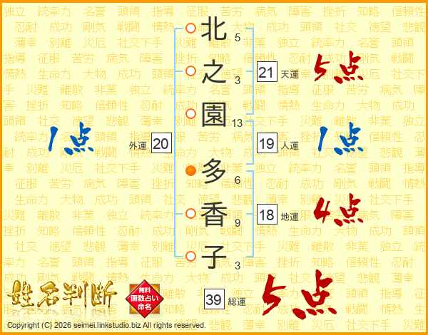 北(5画)之(3画)園(13画) 多(6画)香(9画)子(3画)