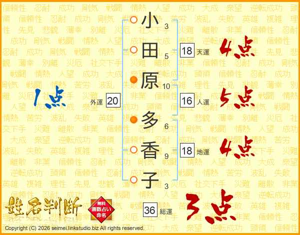 小(3画)田(5画)原(10画) 多(6画)香(9画)子(3画)