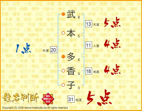 武(8画)本(5画) 多(6画)香(9画)子(3画)