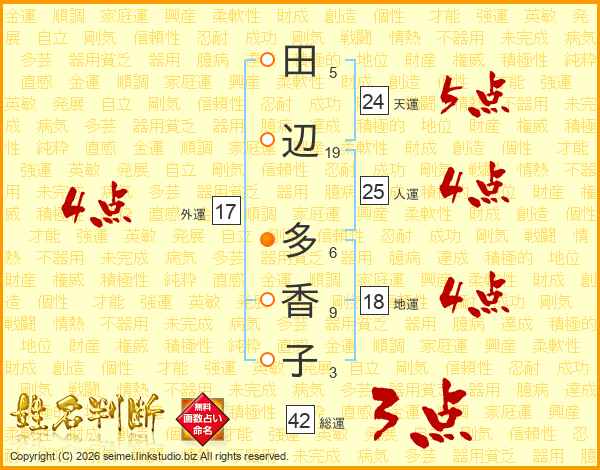 田(5画)辺(19画) 多(6画)香(9画)子(3画)